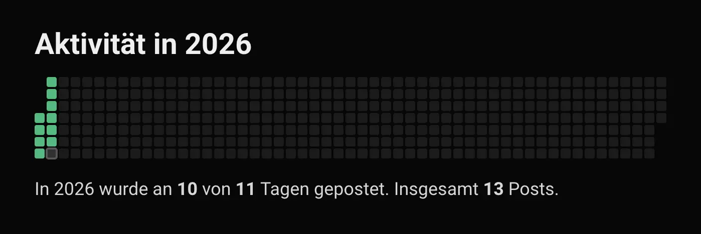Daher gibt es jetzt auf der Archivübersichtsseite eine Github-Commit-History-ähnliche Post-Heatmap, die zeigt an welchen Tagen ich in diesem Jahr gebloggt habe: